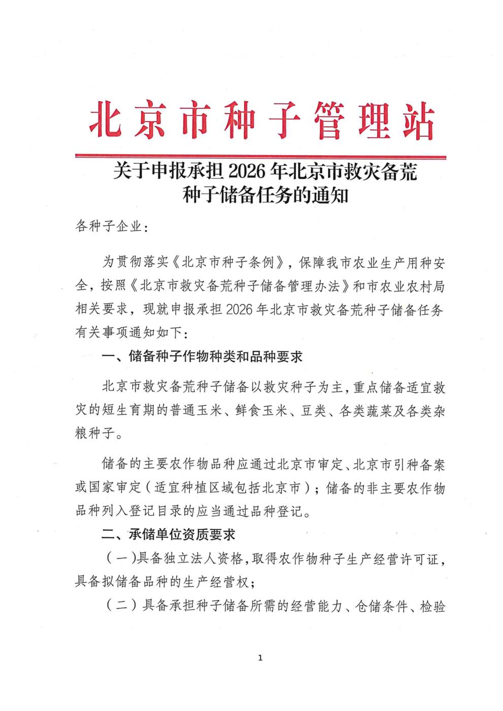 关于申报承担2026年北京市救灾备荒种子储备任务的通知
